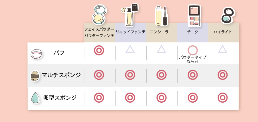 メイクスポンジとパフで対応できるメイクアイテムは下記の表のとおりです。