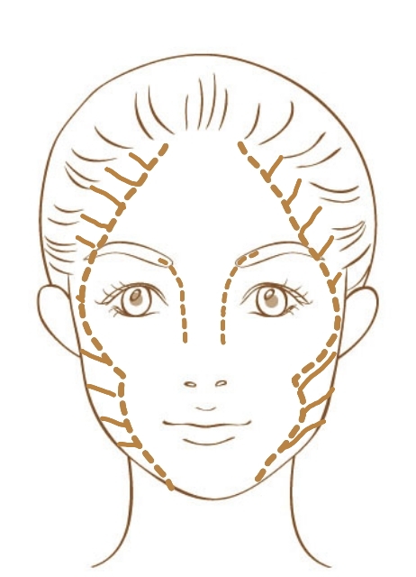 縦長に見える様、顔の両サイドを削ぎ落すイメージでシェーディングカラーをなじませます。ふっくらした頬がすっきりシャープにみえる様に頬の部分はやや内側まで。イラストの様に『3』の形に入れます。