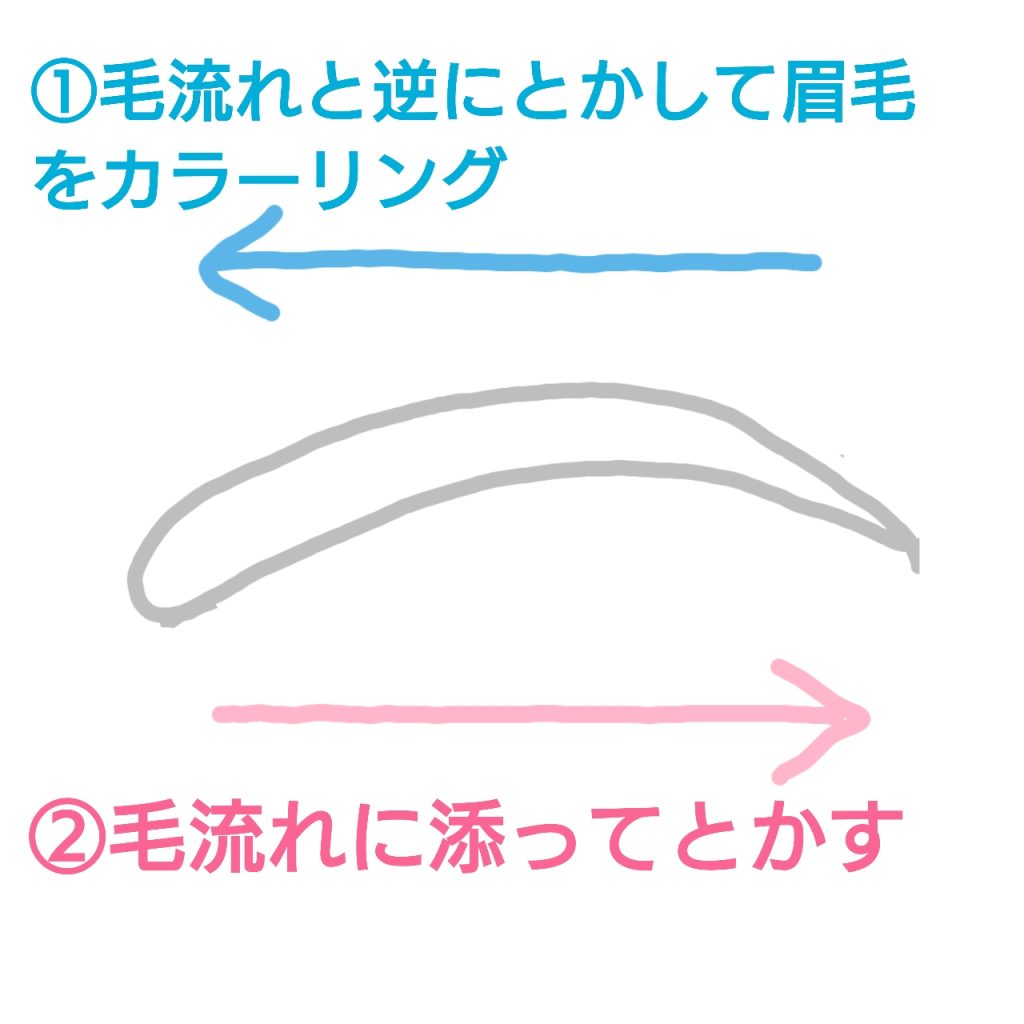 塗り方はまず、毛流れと逆方向に塗り、そして毛流れを整えるようにとかして塗ります。そうすることで、眉毛一本一本の周りをぐるりとカラーコーティングすることができます。